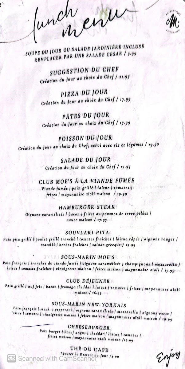 “ You can’t go wrong at Moe’s! Fantastic service by Karine and the food was perfect. We started with the nachos and a bottle of wine and then we each had the catch of the day which was the trout with a sun dried tomato pesto sauce (soooooo good) ended our meal with a piece of carrot cake. Great terrace and we had such a wonderful time. ”